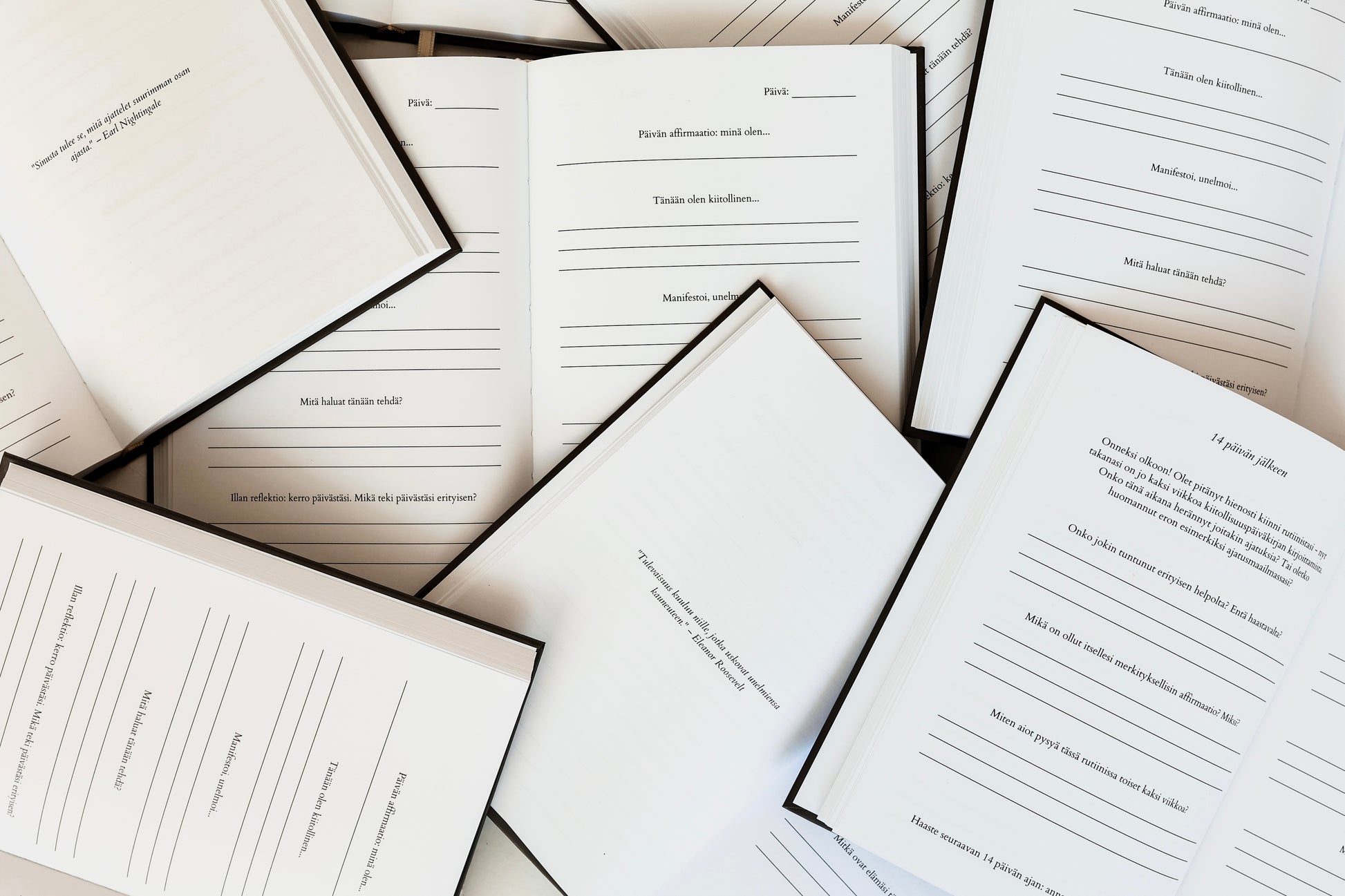 ✍🏼 180 sivua päivittäisille merkinnöille – ilman suorituspaineita. Jokainen päiväsivu koostuu neljästä aamun kysymyksestä sekä illan rauhoittavasta reflektiosta, jotka tukevat hyvää mieltä läpi päivän.